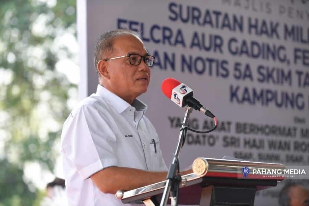YAB Menteri Besar Pahang, Dato’ Sri Haji Wan Rosdy Wan Ismail ketika Majlis Penyerahan Suratan Hak Milk Rancangan FELCRA Aur Gading, FELCRA Sungai Temau dan Notis 5A Kampung Relong di Dataran Tok Linggi, Kampung Relong di Lipis