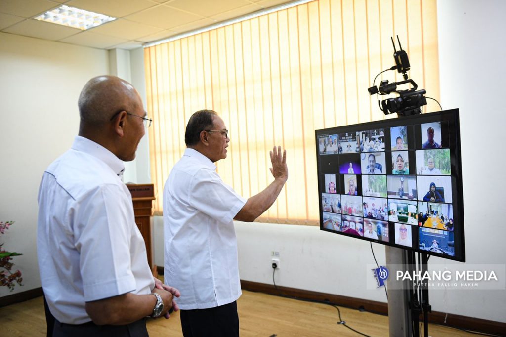 YAB Menteri Besar Pahang juga mengambil kesempatan beramah mesra bersama ketua-ketua jabatan dan pegawai-pegawai daerah yang turut menyertai sesi pelancaran hari ini secara atas talian di Pejabat Pengarah Tanah dan Galian (PTG) Pahang. -PAHANGMEDIA
