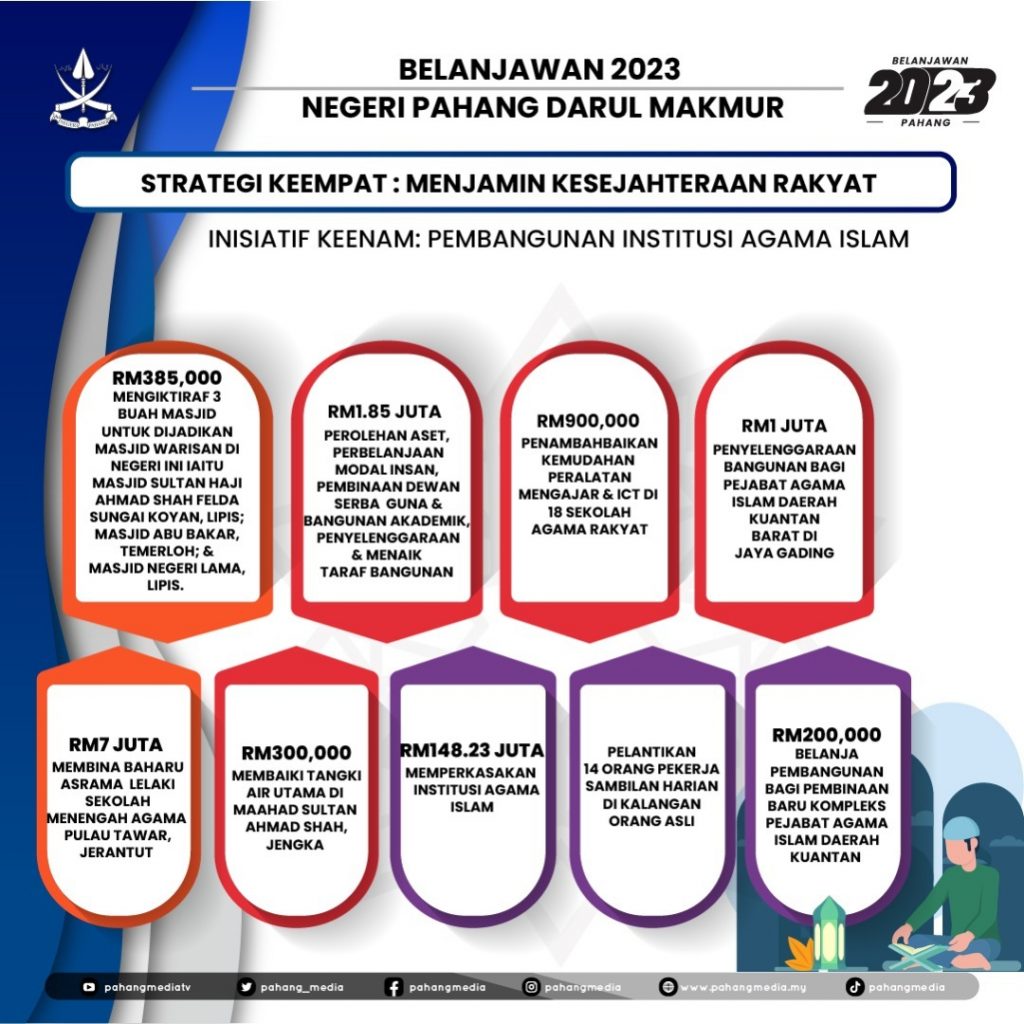 KUANTAN, 7 OKTOBER 2022: Peruntukan sebanyak RM148.23 juta disediakan bagi memperkasakan Jabatan Agama Islam Negeri Pahang (JAIP), Jabatan Kehakiman Syariah Negeri Pahang, Jabatan Pendakwaan Syariah Negeri Pahang dan Jabatan Mufti Negeri Pahang.