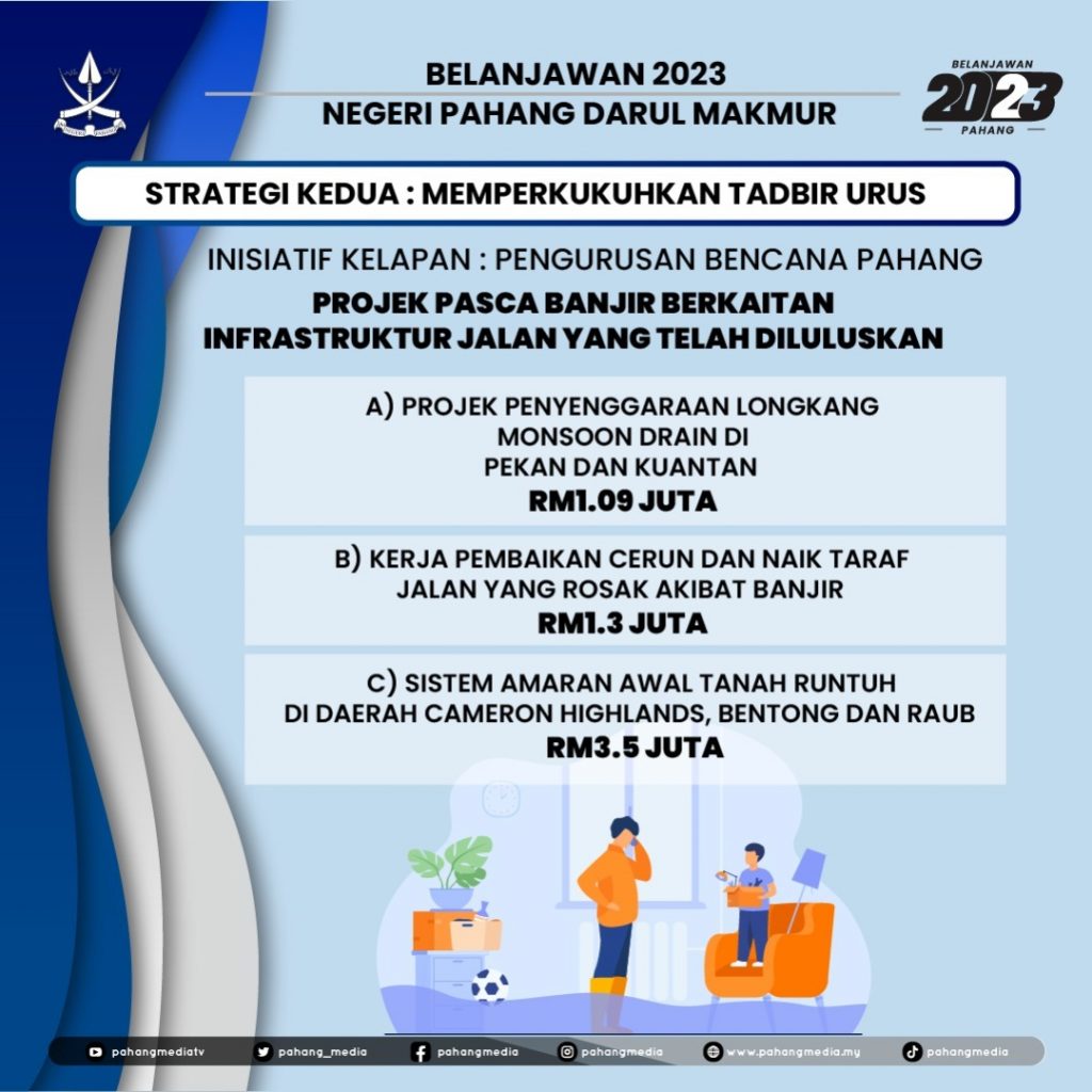“Projek Penyenggaraan Monsoon Drain di daerah Pekan dan Kuantan sebanyak RM1.09 juta. Kerja pembaikan cerun dan naik taraf infrastruktur jalan yang rosak akibat banjir berjumlah RM1.3 juta.