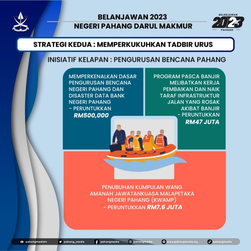 “Justeru, untuk tahun 2023, kita sudah menyusun pelbagai langkah dan persediaan. Antara langkah utama yang akan kita laksanakan adalah pertama, memperkenalkan Dasar Pengurusan Bencana Negeri Pahang dan Disaster Data Bank Negeri Pahang.