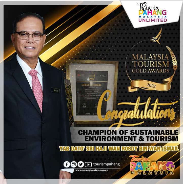 KUANTAN, 23 OKTOBER 2022 : YAB Menteri Besar Pahang, Dato’ Sri Haji Wan Rosdy Wan Ismail telah menerima anugerah Juara Alam Sekitar & Pelancongan Lestari (Champion of Sustainable Environment & Tourism) daripada Malaysia Tourism Council.