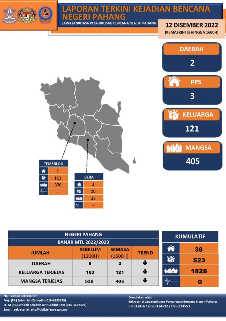 KUANTAN, 12 DISEMBER 2022 : Mangsa banjir di negeri ini menurun kepada 405 mangsa setakat ini berbanding 573 mangsa pagi tadi yang melibatkan dua daerah iaitu Bera dan Temerloh.