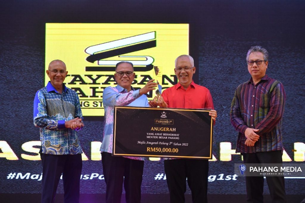 KUANTAN, 30 DISEMBER 2022 : Yayasan Pahang mengungguli Anugerah Pahang 1st apabila berjaya membawa pulang RM50,000 selepas dinobatkan sebagai penerima Anugerah YAB Menteri Besar Pahang pada majlis yang berlangsung meriah di Dewan Bandaraya, Majlis Bandaraya Kuantan (MBK), semalam.