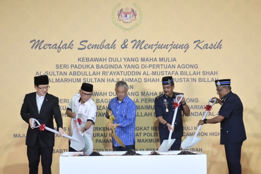 CAMERON HIGHLANDS, 4 MAC 2023 : Kebawah Duli Yang Maha Mulia Seri Paduka Baginda Yang di-Pertuan Agong, Al-Sultan Abdullah Ri’ayatuddin Al-Mustafa Billah Shah Ibni Al-Marhum Sultan Haji Ahmad Shah Al-Musta’in Billah berkenan bercemar duli menyempurnakan Majlis Pecah Tanah Tapak Surau Ibu Pejabat Polis Daerah (IPD) Cameron Highlands.