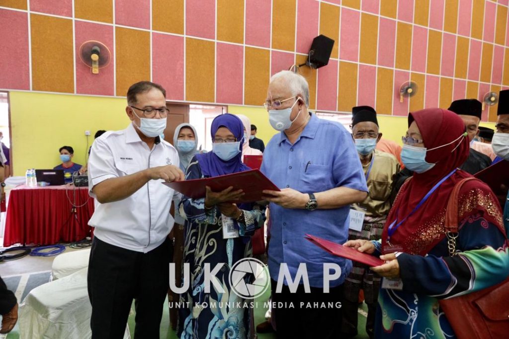 Peneroka Felda Chini, Ali Asra Hussin (tengah) menerima geran tanah daripada Jawatankuasa Sains, Teknologi, Teknologi Hijau, Teknologi dan Multimedia Negeri Pahang, YB Dato’ Haji Mohammad Fakhruddin Mohd Ariff (dua kanan).Bagi seorang lagi peneroka, Ali Asra Hussin, 68, dia amat berterima kasih kepada Kerajaan Negeri Pahang dan juga Menteri Besar Pahang, YAB Dato’ Sri Haji Wan Rosdy Wan Ismail kerana menunaikan impian mereka untuk memiliki geran tanah.