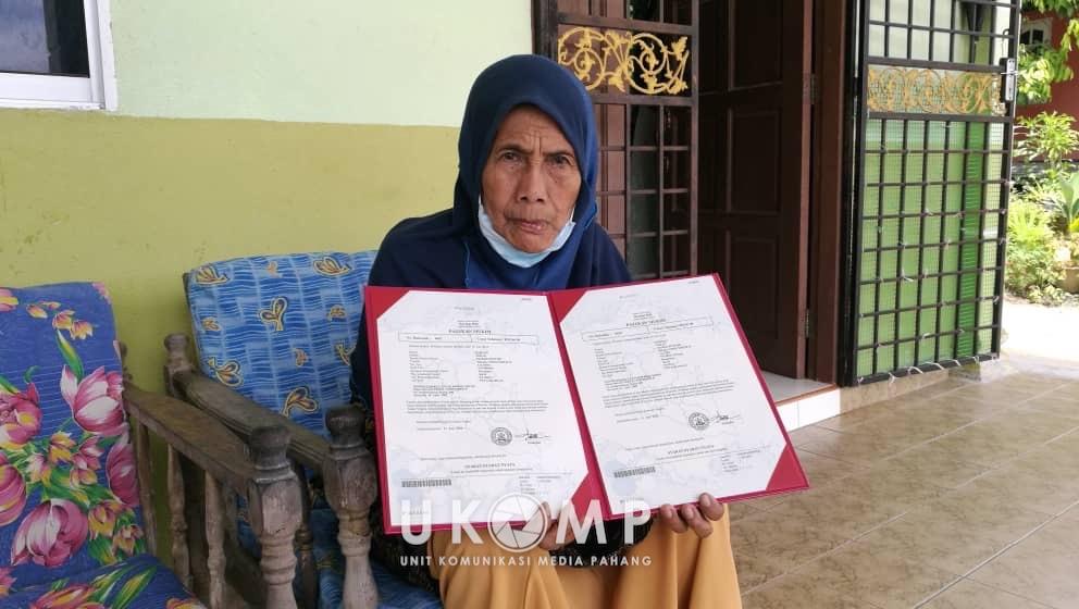 PEKAN, 14 JUN 2020: Terharu dan bersyukur. Hanya itu mampu diluahkan oleh Muhaini Abdul Rahman, 65, apabila geran tanah yang dinanti sejak 35 tahun akhirnya di genggaman.