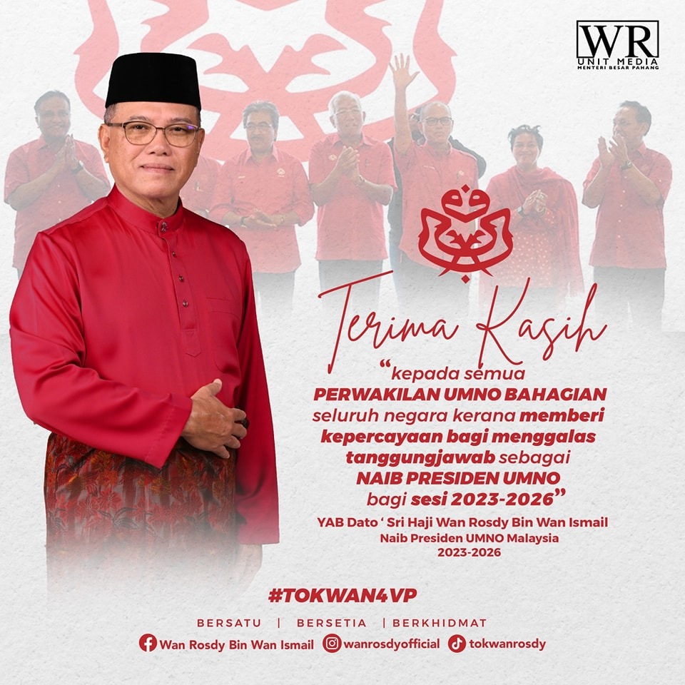 KUANTAN, 19 MAC 2023 : YAB Dato’ Sri Haji Wan Rosdy Wan Ismail menyifatkan kejayaan dipilih sebagai Naib Presiden UMNO merupakan satu tanggungjawab yang cukup besar untuk membantu Presiden, Timbalan Presiden serta seluruh kepimpinan UMNO terutamanya dalam keadaan parti yang cukup getir ketika ini.