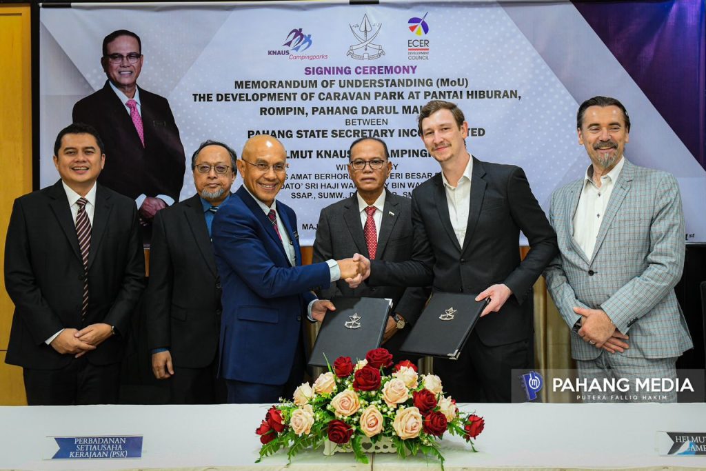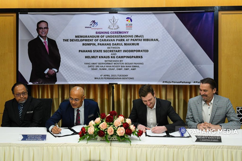 MoU ini telah ditandatangi oleh YB. Setiausaha Kerajaan Pahang, Dato’ Sri Dr. Sallehuddin Ishak dengan wakil Helmut Knaus KG CampingParks, Mr. Maximilian Helmut Gregor Haubner.