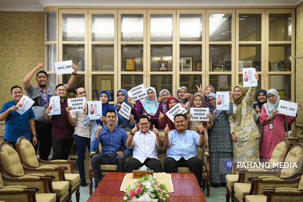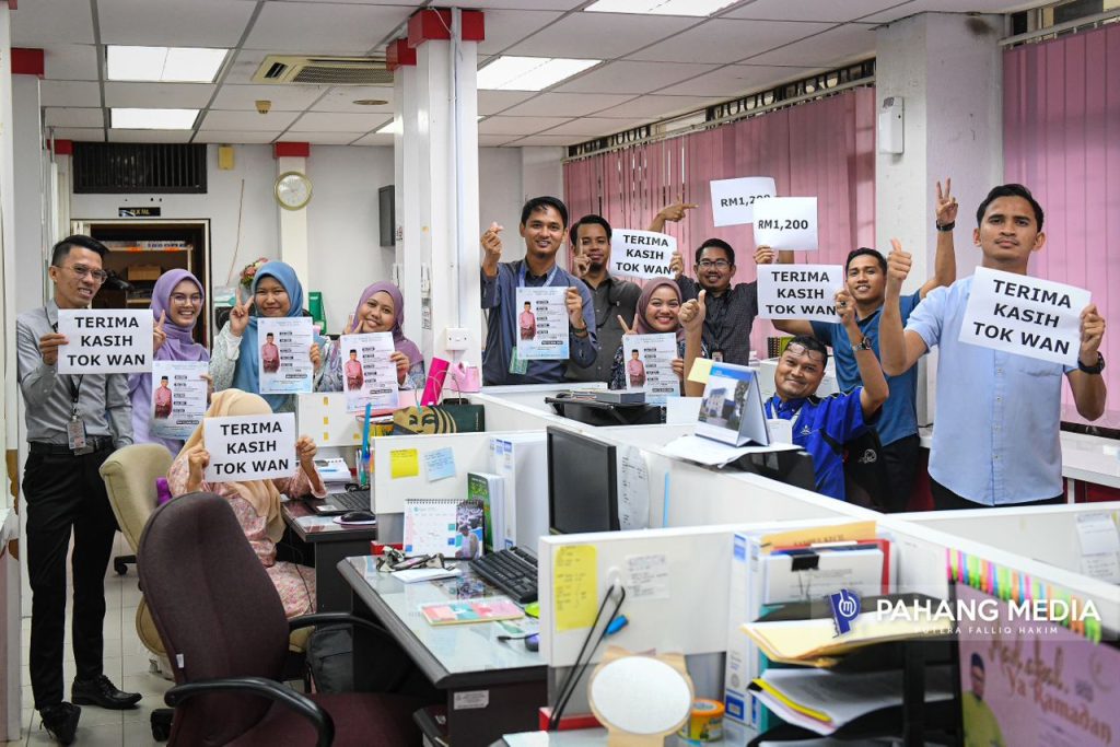 “Pertamanya, terima kasih kepada MB kerana bagi bonus kepada penjawat awam Negeri Pahang, InsyaaAllah saya akan menggunakan untuk persiapan hari raya nanti. Terima kasih, Tok Wan,” katanya.