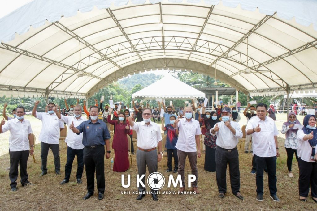 Menteri Besar Pahang, YAB Dato' Sri Haji Wan Rosdy Wan Ismail bersama pemimpin Pusat dan Kerajaan Negeri bergambar bersama penerima Surat Tawaran Peserta Rancangan Tanah Kelompok Kampung Orang Asli Gumum, Pekan hari ini.