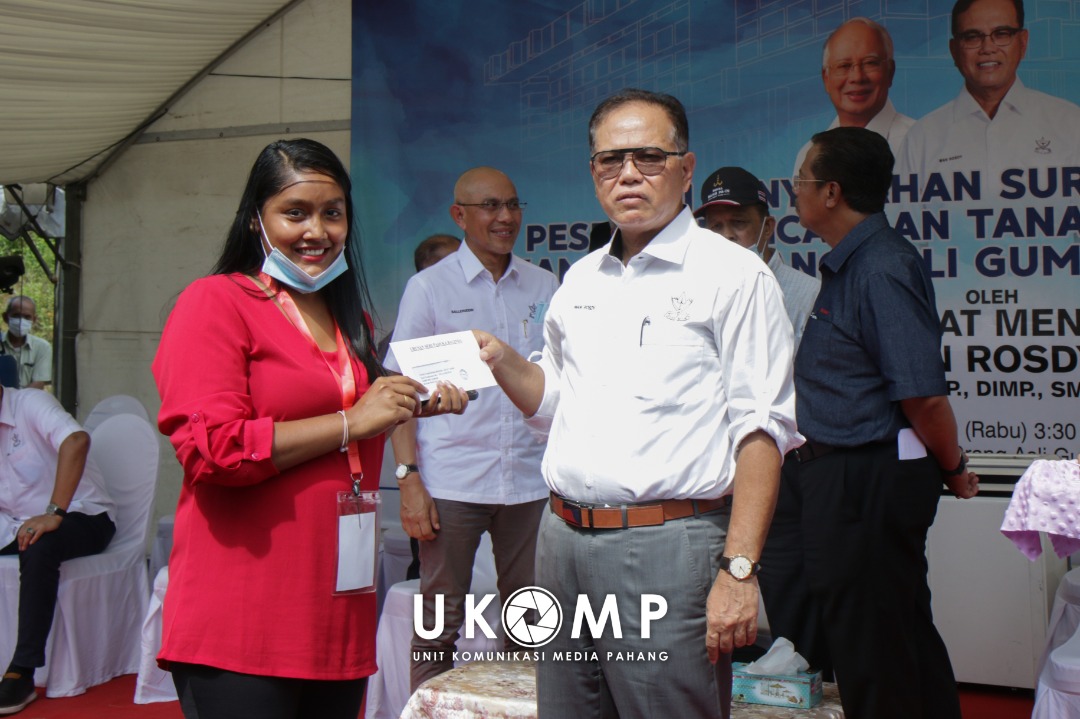 Menteri Besar Pahang, YAB Dato’ Sri Haji Wan Rosdy Wan Ismail menyampaikan Surat Tawaran Peserta Rancangan Tanah Kelompok Kampung Orang Asli Gumum kepada salah seorang peserta di Pekan hari ini.