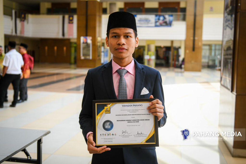 Seorang lagi penerima Biasiswa Kecemerlangan Menteri Besar Pahang (BKMB), Muhammad Ashraf Aiman Mohd Imran, 18, yang kini melanjutkan pelajaran di Pusat Asasi Sains Hayat, Universiti Malaya turut menghargai peranan Yayasan Pahang dalam membentuk kecemerlangannya pada hari ini.