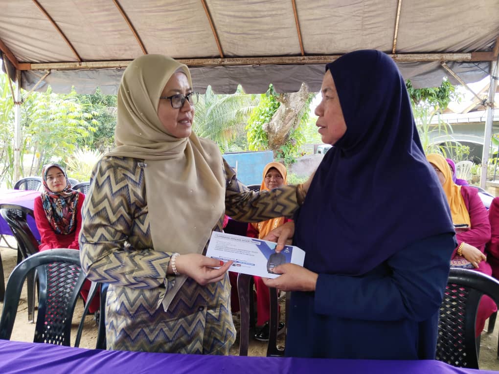Cek sumbangan berjumlah RM5,000 diserahkan oleh Exco Kebajikan Masyarakat, Pembangunan Wanita dan Keluarga Negeri Pahang, YB. Dato’ Sabariah Saidan kepada ibu Allahyarham Azizah Eiyi, 40, iaitu Puan Halimah Kassim, 63, di kediamannya di Felda Lepar Hilir 3.