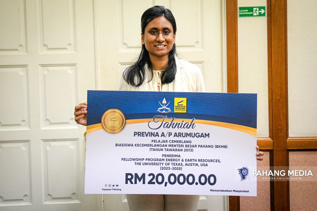Bagi penerima Biasiswa Kecemerlangan Menteri Besar (BKMB) Pahang, Cik Previna Arumugam, 28, jumlah tajaan sebanyak RM20,000 sangat membantu dan dapat menampung kos awal pengajiannya termasuk pembiayaan tiket penerbangan, visa dan lain-lain.