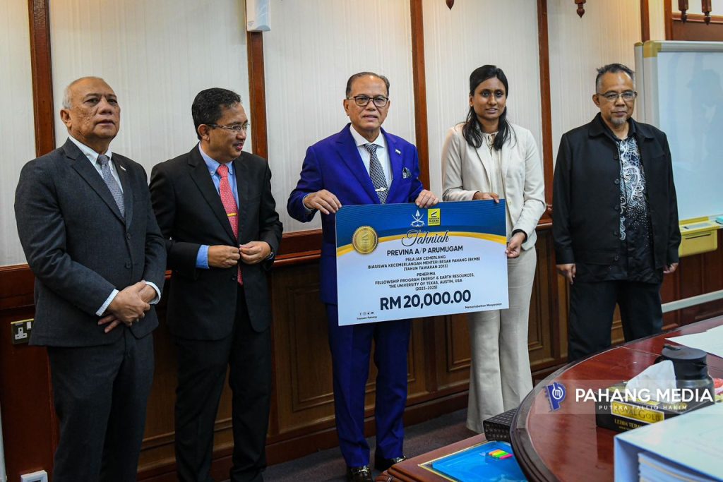 Penerima Biasiswa Kecemerlangan Menteri Besar (BKMB) Pahang, Cik Previna Arumugam menerima replika cek tajaan daripada YAB Menteri Besar Pahang, Dato' Sri Haji Wan Rosdy Wan Ismail