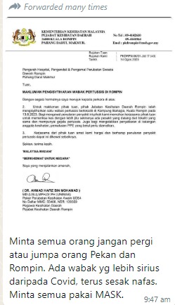 Itu penjelasan Pengarah Jabatan Kesihatan Pahang (JKNP), Dato’ Indera Dr Nor Azimi Yunus berikutan viral (tular) di media sosial yang mendakwa penyakit tersebut menjadi ancaman yang lebih teruk selepas wabak Covid-19 dan orang ramai dinasihatkan agar tidak datang ke daerah Rompin bagi mengelak dijangkiti penyakit berkenaan.
