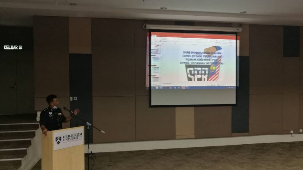 Ketua Polis Daerah Pekan, Superintendan Mohd Razli Mohd Yusof ketika memberi Taklimat SOP PRK Chini di Auditorium Universiti DRB-Hicom, Pekan, hari ini.
