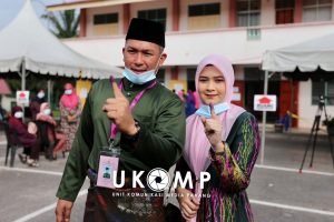 Beliau yang berbaju melayu hijau hadir bersama isteri, Norhiliyana Abdul Hamid, 27, pada jam 9.10 pagi sebelum mengundi di saluran empat di Sekolah Agama Rakyat (SAR) Kelas Al-Quran dan Fardhu Ain (KAFA) Felda Chini 3.