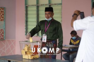 PEKAN, 04 JULAI 2020 : Calon Barisan Nasional, Pilihan Raya Kecil (PRK) Dewan Negeri (DN) Chini, Mohd Sharim Md. Zain berpuas hati dengan perjalanan mengundi setelah selesai mengundi di Felda Chini 3, di sini hari ini.