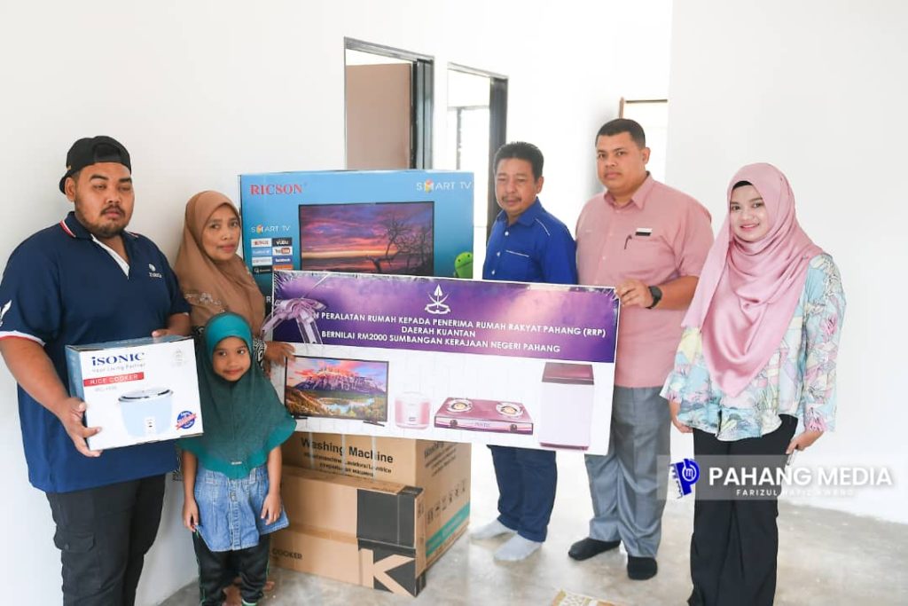 Rumah Rakyat Pahang berserta kelengkapan barangan elektrik bernilai RM2,000 yang terletak di Kampung Pandan 1 itu diserahkan kepada Puan Normah oleh YH Dato’ Haji Mohd Zaili Haji Besar yang mewakili Ahli Parlimen Paya Besar. – PAHANGMEDIA