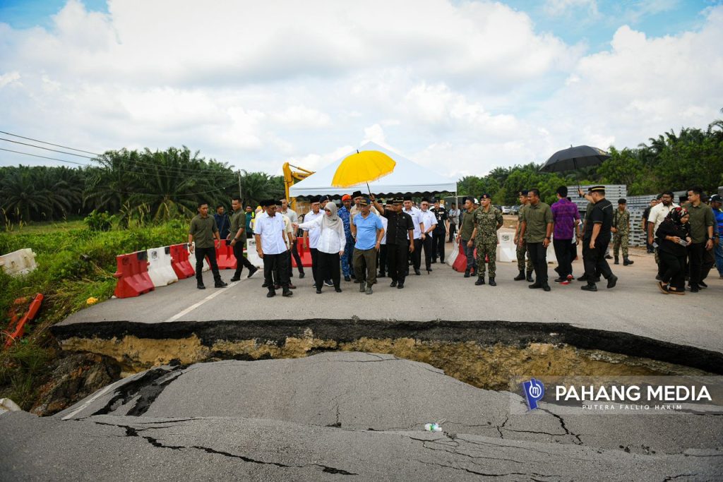 Seri Paduka Baginda telah berkenan mendengar sembah taklimat daripada Pengarah Jabatan Kerja Raya (JKR) Pahang, YBrs. Ir. Hafizah Zakaria mengenai kejadian tersebut dan tindakan yang dijalankan oleh pihak JKR.