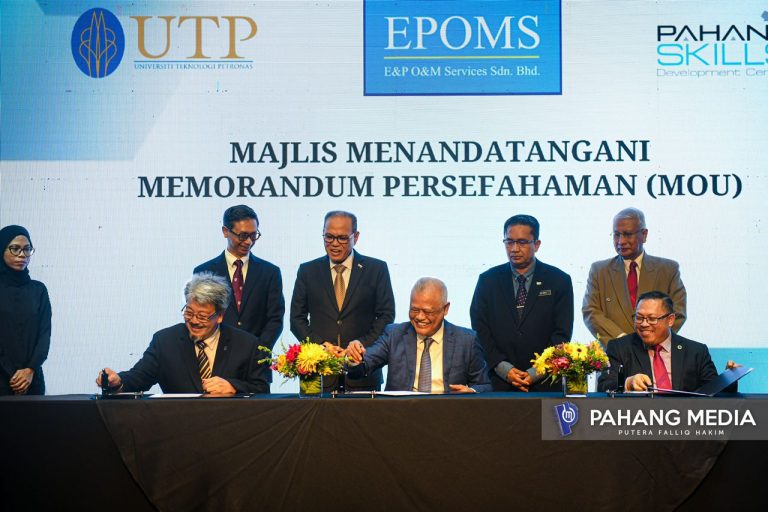 Majlis menandatangani MoU itu telah disempurnakan oleh Naib Canselor Universiti Teknologi Petronas, YBhg Profesor Dato’ Ts Dr Mohamed Ibrahim Abdul Mutalib, Pengarah Eksekutif Pahang Skills, YBhg Encik Mohd Yusri Mohd Nor dan Pengarah EPOMS, YH Dato’ Mohd Pathil Ahmad.