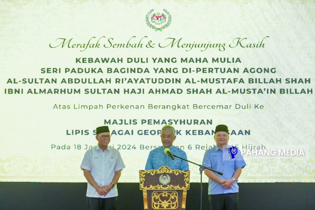 LIPIS, 18 JANUARI 2024 : Kebawah Duli Yang Maha Mulia Seri Paduka Baginda Yang di-Pertuan Agong, Al-Sultan Abdullah Ri’ayatuddin Al-Mustafa Billah Shah Ibni Al-Marhum Sultan Haji Ahmad Shah Al-Musta’in Billah bertitah supaya Kerajaan Negeri Pahang memberikan tumpuan khusus berkenaan kelestarian alam sekitar dalam melaksanakan pembangunan.