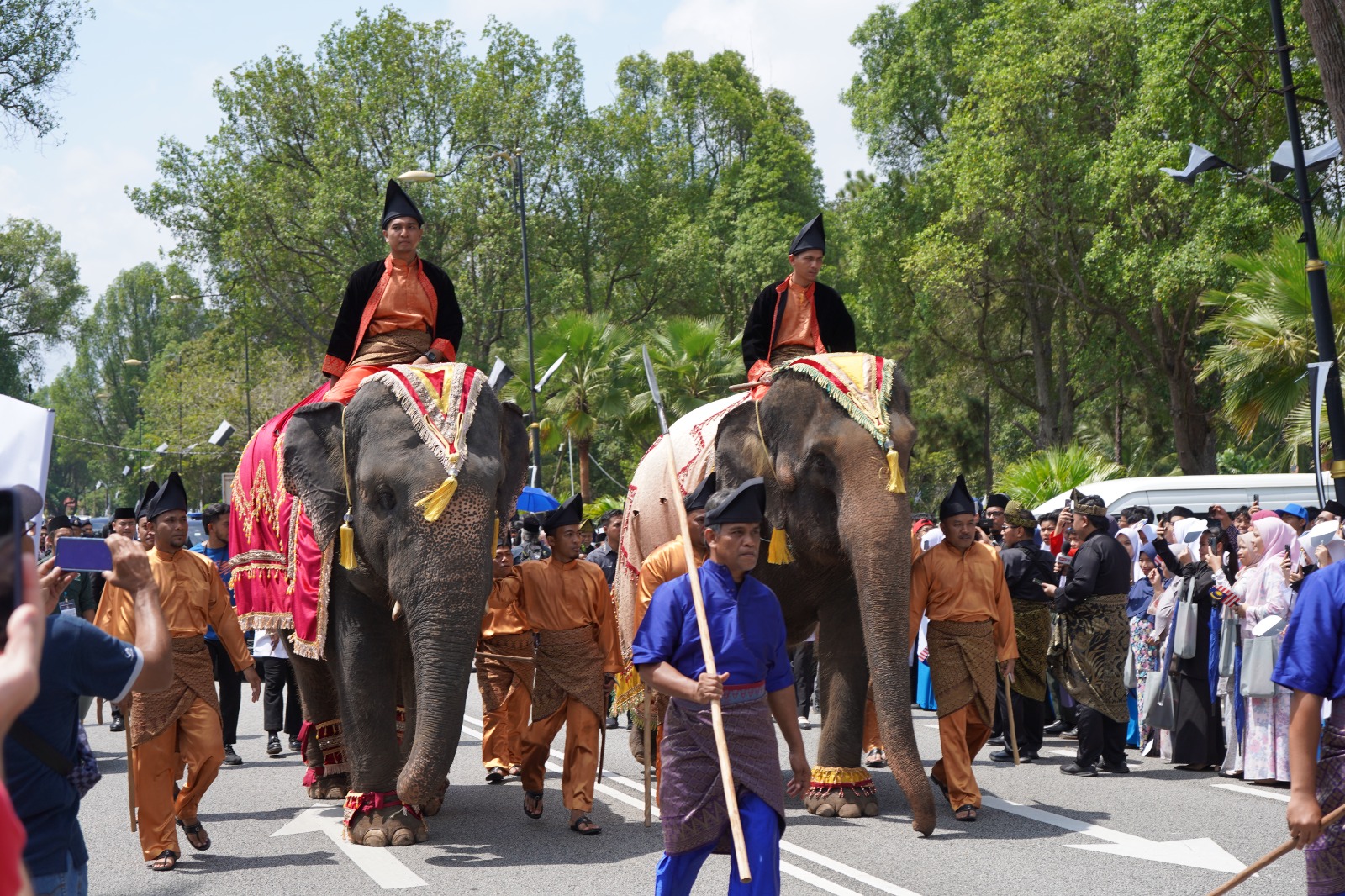 Dua ekor gajah yang didatangkan khas dari Pusat Konservasi Gajah Kebangsaan Kuala Gandah Lanchang tersebut mengiringi kenderaan yang membawa Seri Paduka Baginda berdua bermula dari persimpangan Jalan Dato Abu Samah sehingga ke persimpangan Dewan Jubli Perak Haji Sultan Ahmad Shah.