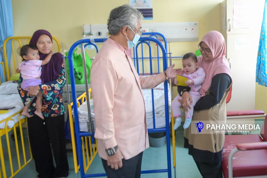 Paduka Baginda meluangkan masa hampir dua jam mendengar persembahan taklimat dan bercemar duli melawat 42 pesakit kanak-kanak di Wad Melor 5A sebelum meluangkan masa melawat En. Mustafa Kamal.