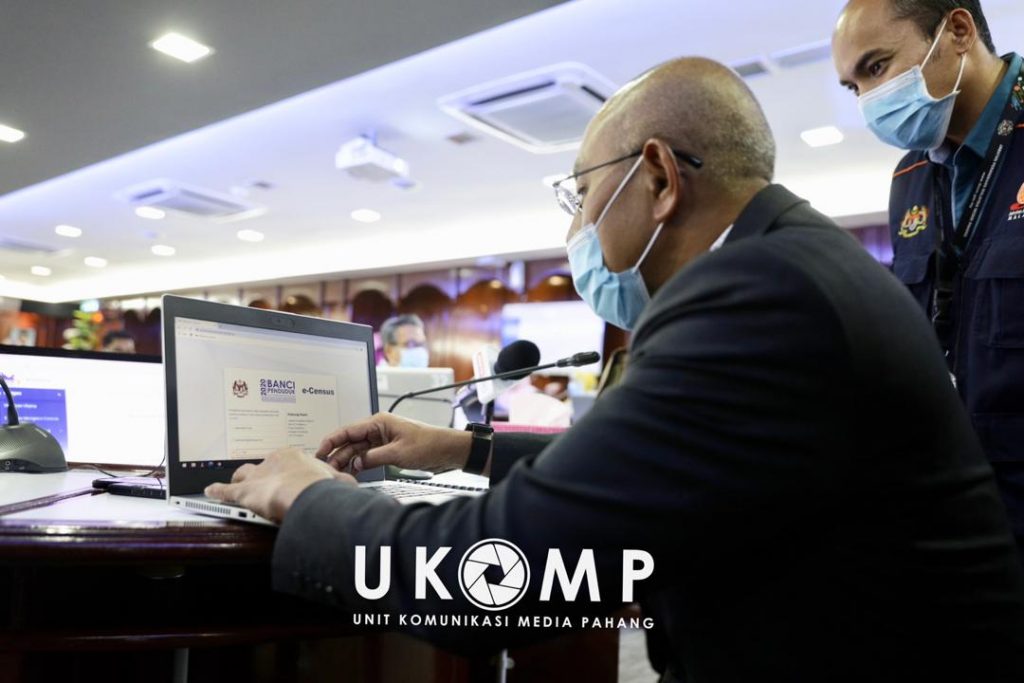 YB Setiausaha Kerajaan Pahang, Dato’ Sri Dr Sallehuddin Ishak mengisi borang soal selidik secara atas talian iaitu e-Census sambil diterangkan oleh Pengarah Jabatan Perangkaan Malaysia Negeri Pahang, Encik Zainol Jamil ketika mengadakan sidang media Banci Penduduk dan Perumahan 2020 (Banci 2020) di Wisma Sri Pahang, Kuantan, hari ini.