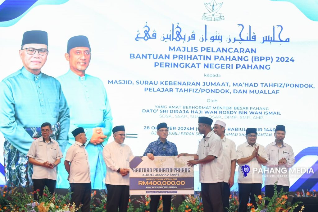 KUANTAN, 28 OKTOBER 2024 : Kerajaan Negeri Pahang menyalurkan Bantuan Prihatin Pahang (BPP) 2024 kepada Masjid Dan Surau Kebenaran Jumaat, Maahad Tahfiz/Pondok, Pelajar Tahfiz/Pondok, dan Mualaf sebanyak RM9.28 juta.