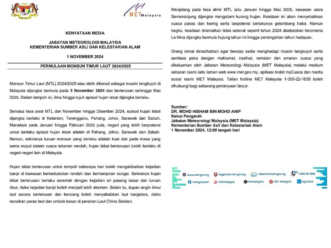 KUANTAN, 04 NOVEMBER 2024 : Penduduk di negeri ini diminta bersiap sedia untuk menghadapi Monsun Timur Laut (MTL) yang dijangka bermula 5 November ini.