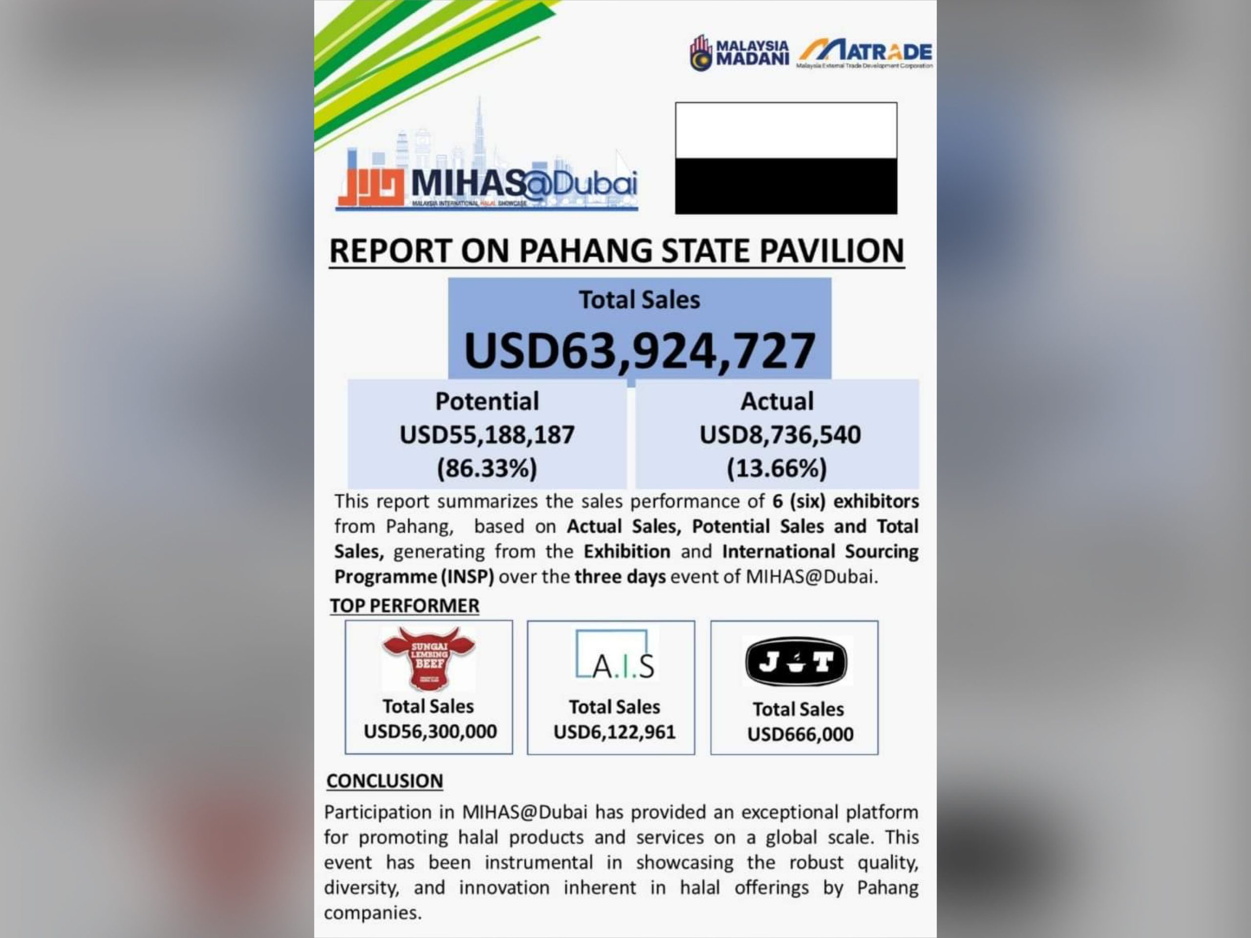 KUANTAN, 22 NOVEMBER 2024 : Pahang berjaya mencatatkan kejayaan luar biasa melalui penyertaan di Pameran Halal Antarabangsa Malaysia (MIHAS) di Dubai, baru-baru ini, dengan jumlah jualan keseluruhan sebanyak USD63.9 juta.