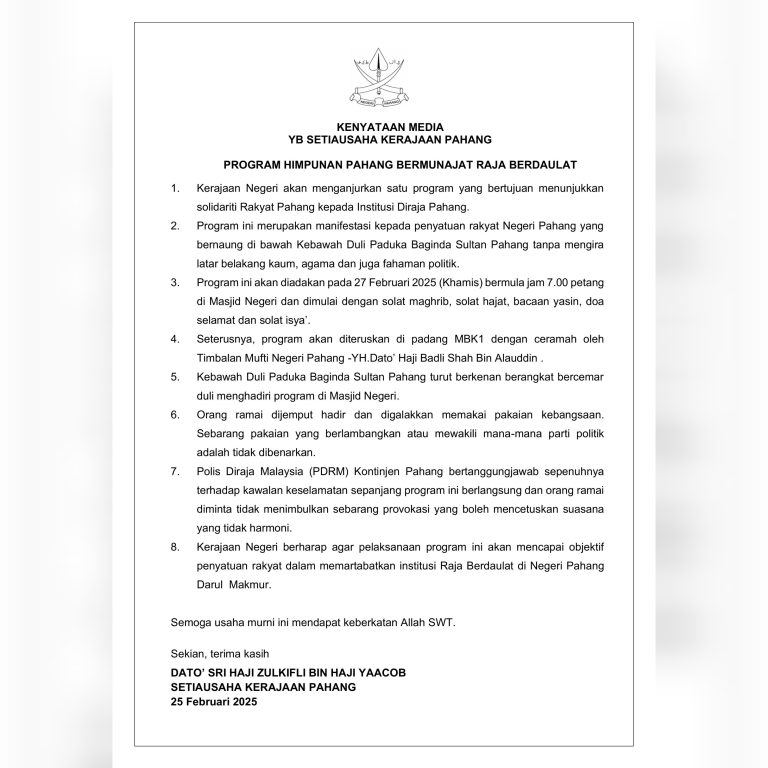 KUANTAN, 25 FEBRUARI 2025 : Kerajaan Negeri Pahang akan menganjurkan satu Program Himpunan Pahang Bermunajat, Raja Berdaulat bagi menunjukkan solidariti rakyat Pahang kepada Institusi Diraja Pahang.