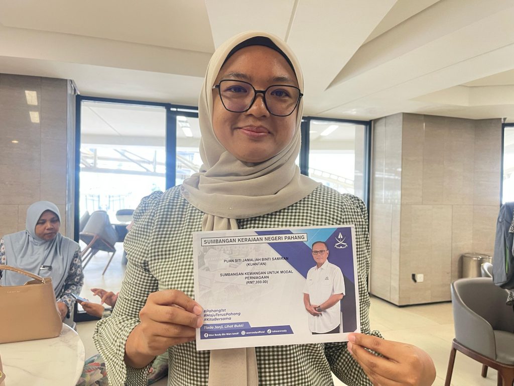Menurut Puan Siti Jamaliah Samiran, 40, dari Bukit Rangin, beliau meluahkan rasa syukur dan gembira atas bantuan modal perniagaan daripada Kerajaan Negeri untuk menjalankan perniagaan manisan dan kerepek yang telah diusahakan sejak tiga tahun lepas.