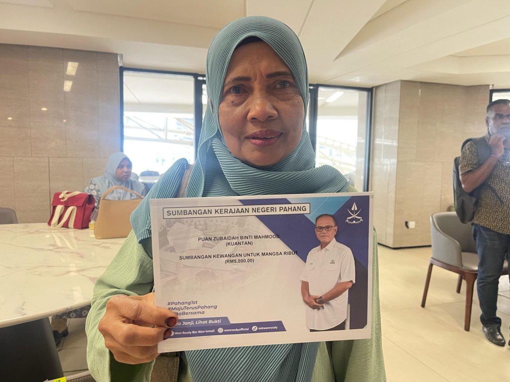 Seorang lagi penerima, Puan Zubaidah Mahmood, 62, turut melahirkan rasa kesyukuran yang tidak terhingga di atas pemberian sumbangan Kerajaan Negeri Pahang bagi membantunya membaikpulih kedai makanan yang rosak akibat dilanda ribut pada Jun lepas.