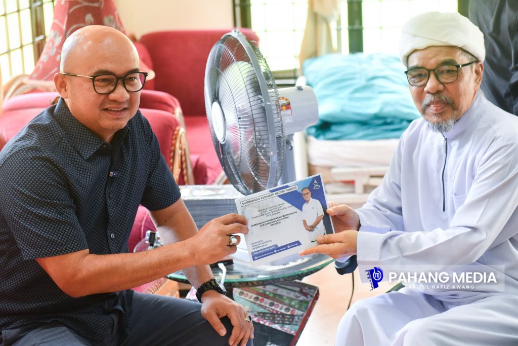 “Dan hari ini saya mewakili YAB Dato’ Sri Diraja Wan Rosdy Wan Ismail, Menteri Besar Pahang, saya sampaikan sumbangan Menteri Besar kepada beliau berjumlah RM5,000. Ini bagi membantu beliau untuk menjalani rawatan selanjutnya.