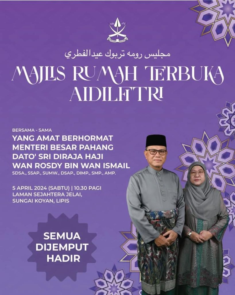 YAB Menteri Besar Pahang dalam satu hantaran di Facebooknya berkata, selain itu, satu lagi majlis rumah terbuka akan diadakan pada 5 April 2025 di Laman Sejahtera Jelai, Sungai Koyan, Lipis dan bermula sekitar 10.30 pagi.