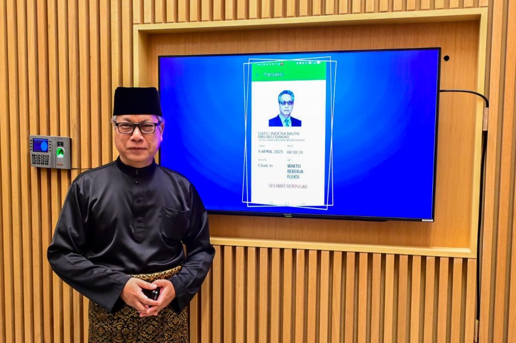 KUANTAN, 09 APRIL 2025 : YB. Setiausaha Kerajaan Pahang yang baharu, Dato’ Indera Nazri Abu Bakar, memulakan tugas rasminya hari ini dengan merekodkan kehadiran melalui sistem perakam waktu digital (clock in) di Aras 6, Pusat Pentadbiran Sultan Ahmad Shah (PPSAS), di sini.