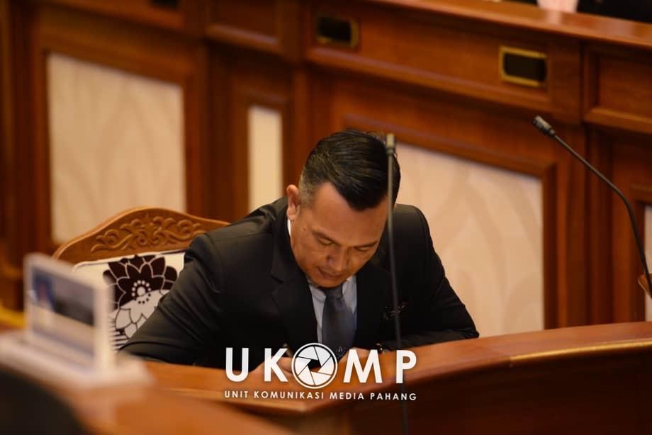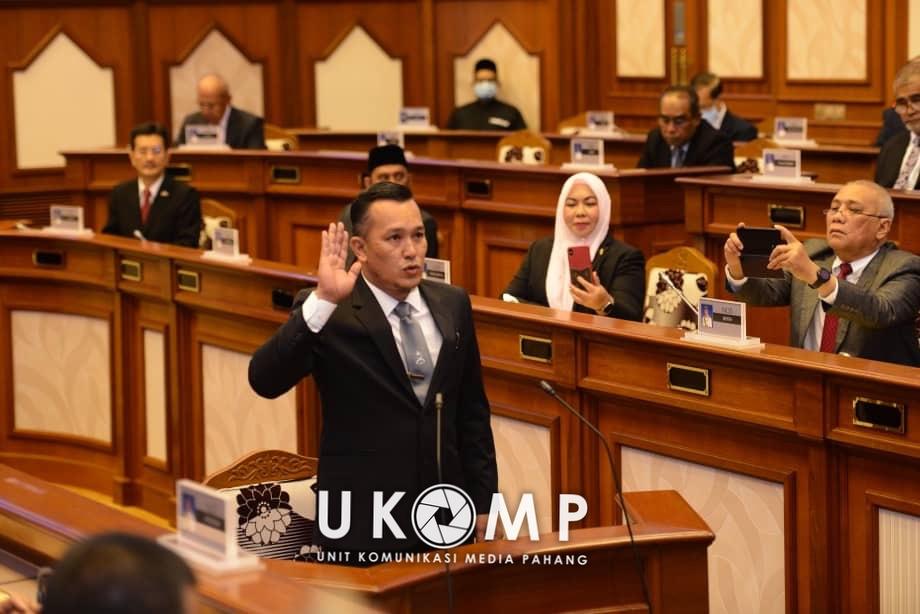 YB. Mohd Sharim, 41, mengangkat sumpah dan menandatangani surat sumpah jawatan di hadapan YB Yang DiPertua Dewan Negeri Pahang, Dato’ Sri Haji Ishak Haji Muhamad.