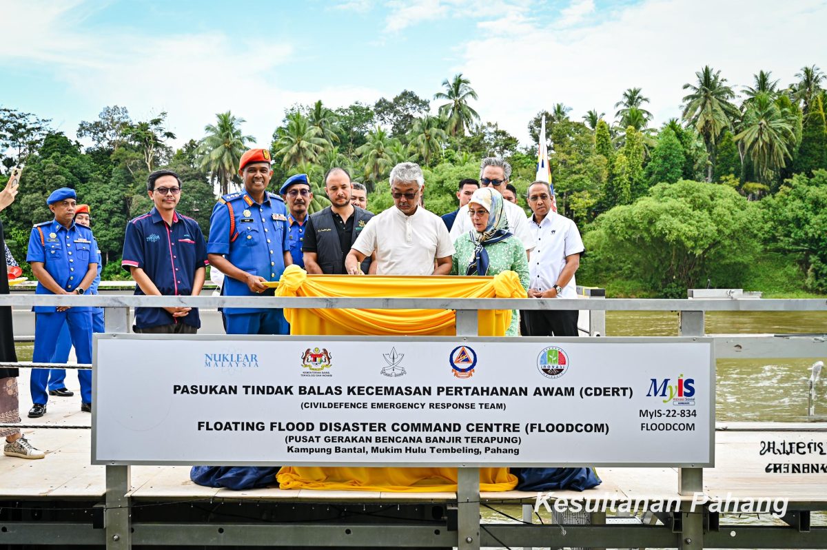 JERANTUT, 16 APRIL 2025 : Kebawah Duli Paduka Baginda Sultan Pahang Al-Sultan Abdullah Ri’ayatuddin Al-Mustafa Billah Shah Ibni Almarhum Sultan Haji Ahmad Shah berkenan merasmikan Pusat Gerakan Bencana Banjir Terapung (FLOODCOM) yang pertama di Malaysia di Kampung Bantal, Hulu Tembeling, di sini, semalam.