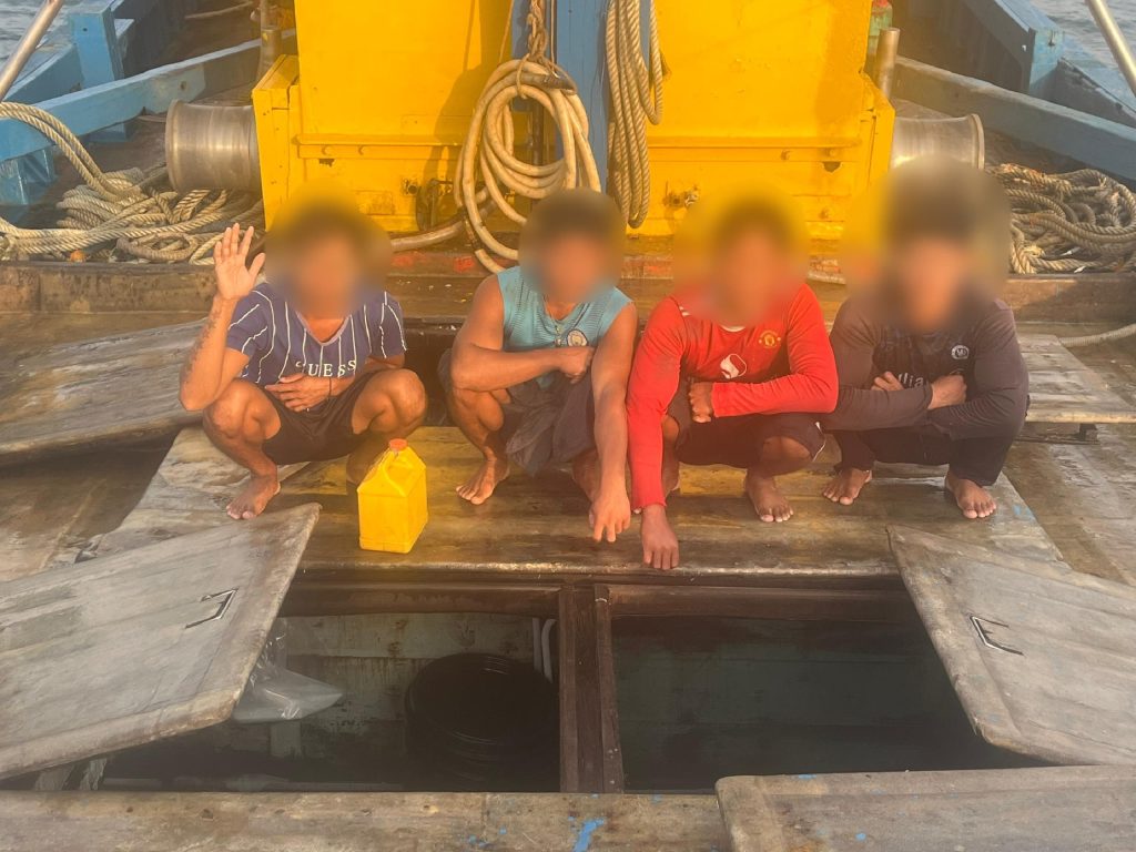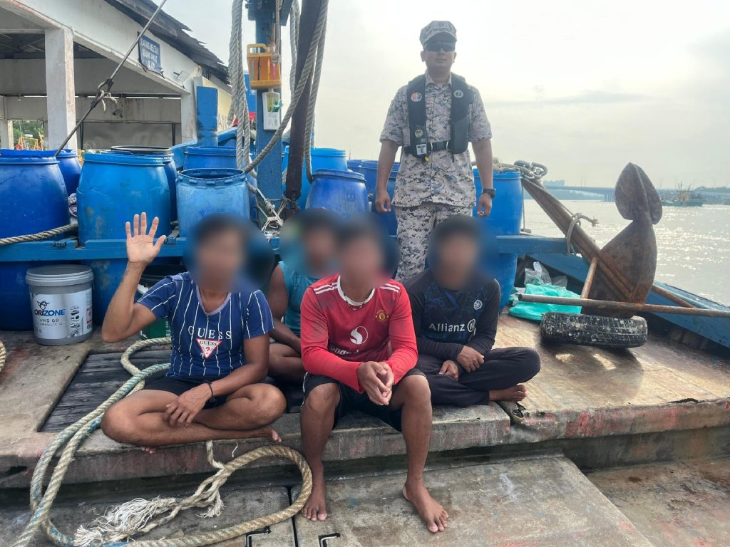 KUANTAN, 26 JUN 2025 : Empat lelaki warganegara Myanmar ditahan Agensi Penguatkuasaan Maritim Malaysia (Maritim Malaysia) Negeri Pahang kerana melanggar syarat lesen nelayan tempatan kira-kira 2.6 batu nautika timur laut perairan Kuala Kuantan semalam.