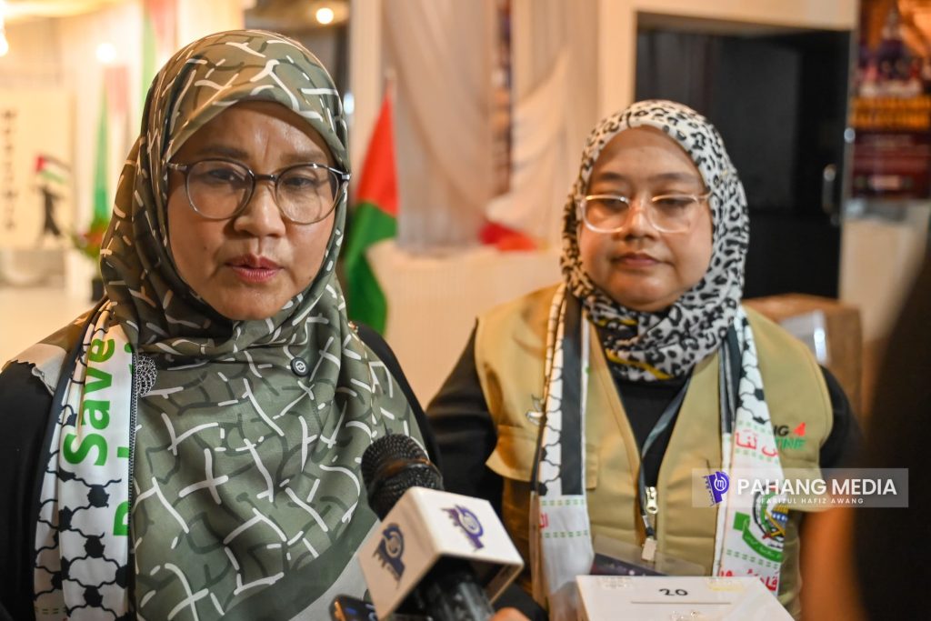 Hadir sama, Pengerusi Jawatankuasa Kebajikan Masyarakat, Pembangunan Wanita dan Keluarga Negeri Pahang, YB. Dato’ Sabariah Saidan dan Setiausaha Sekretariat Pahang4Palestine, Puan Siti Nurul Hidayah Ishak.