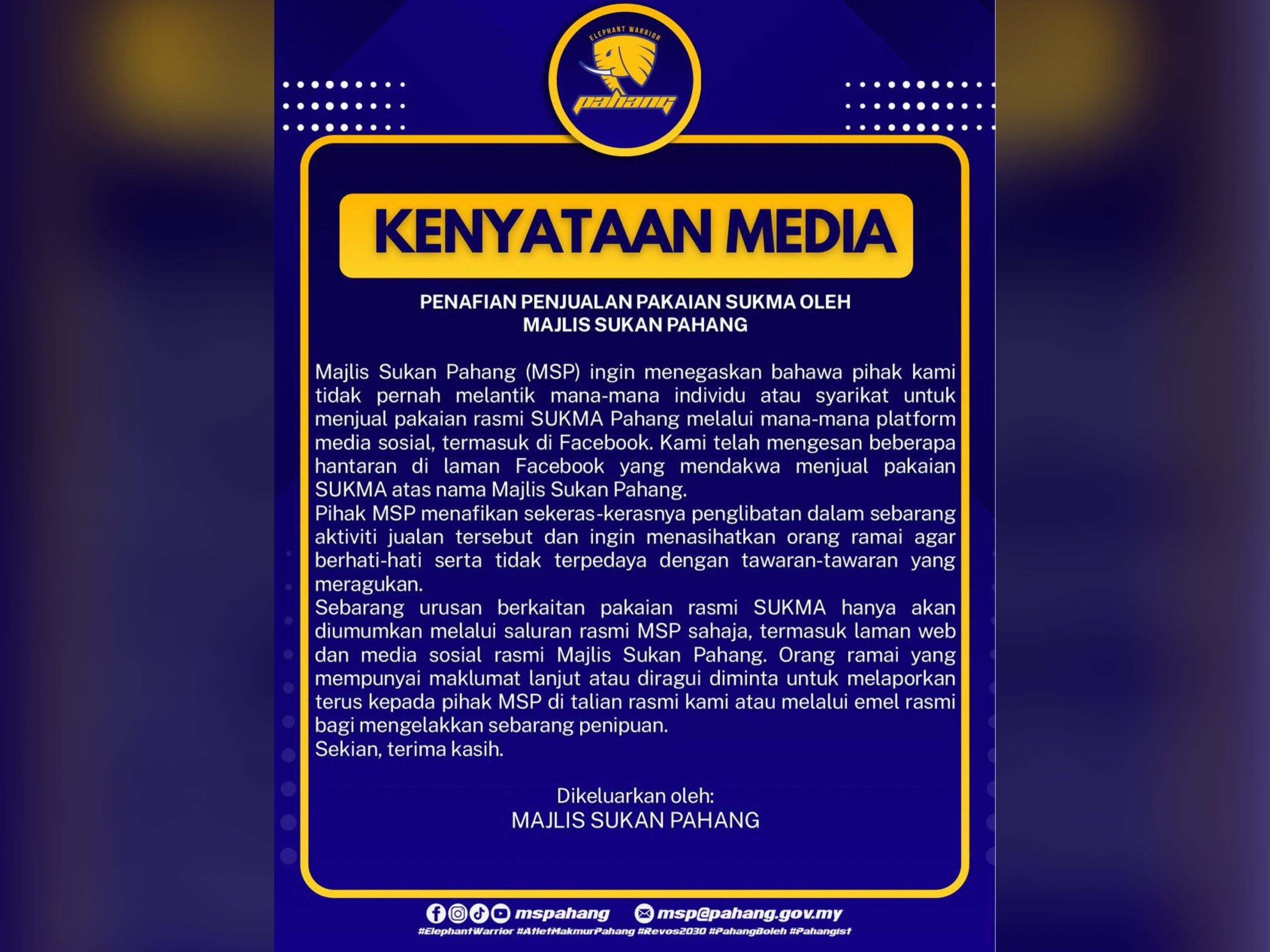 MSP dalam satu kenyataan hari ini memaklumkan, pihaknya tidak pernah melantik mana-mana individu atau syarikat untuk menjual pakaian rasmi SUKMA Pahang di mana-mana platform, termasuk Facebook.