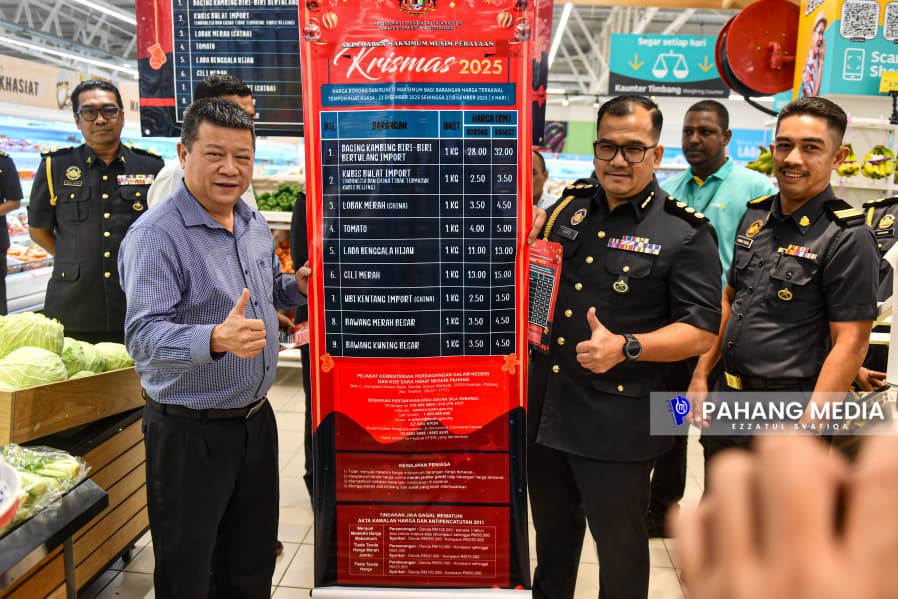 “Menjelang sambutan perayaan Krismas 2025 yang akan disambut pada 25 Disember ini, Kementerian Perdagangan Dalam Negeri dan Kos Sara Hidup (KPDN) Negeri Pahang telah turun padang bagi memantau harga sebenar pelaksanaan Skim Harga Maksimum Musim Perayaan (SHMMP) yang berkuasa dari 23 Disember hingga 27 Disember 2025.