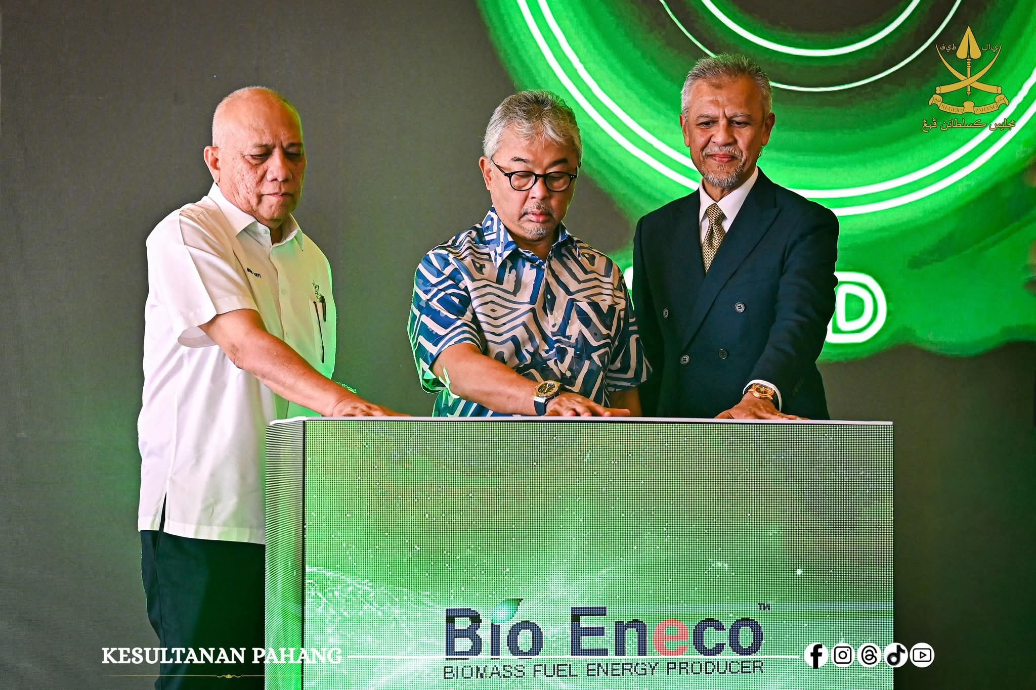Paduka Baginda berkenan menandatangani plak perasmian sebelum berangkat melawat kilang Bio Eneco serta melihat operasi kilang ini yang dijangka dapat memperkukuh peranan Pahang sebagai hab tenaga boleh diperbaharui berorientasikan eksport.