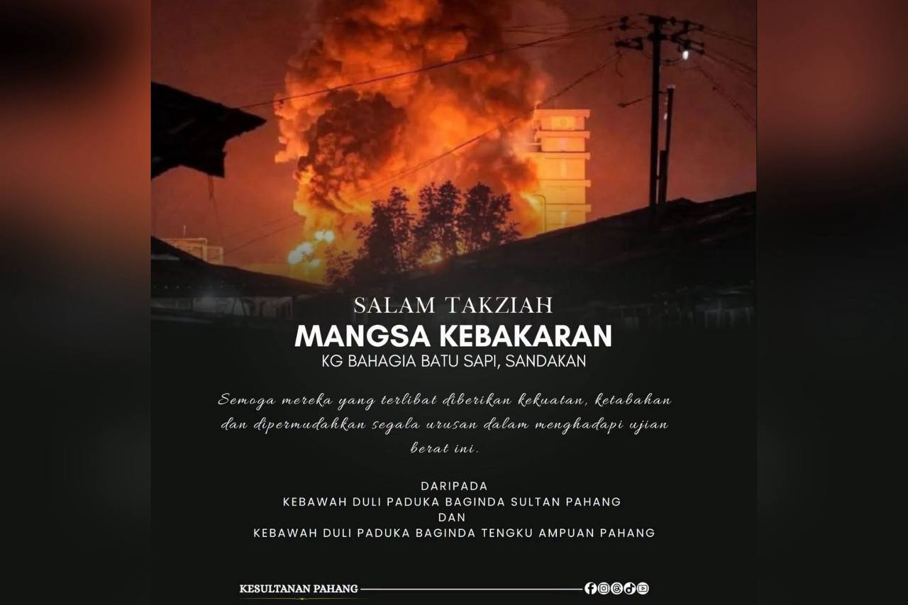 KUANTAN, 20 APRIL 2026 : Kebawah Duli Paduka Baginda Sultan Pahang, Al-Sultan Abdullah Ri’ayatuddin Al-Mustafa Billah Shah Ibni Almarhum Sultan Haji Ahmad Shah bersama Kebawah Duli Paduka Baginda Tengku Ampuan Pahang, Tunku Azizah Aminah Maimunah Iskandariah binti Almarhum Sultan Iskandar Al-Haj menzahirkan rasa dukacita dan simpati yang amat mendalam di atas kejadian kebakaran besar di perkampungan atas air Kampung Bahagia, Batu Sapi di Sandakan, Sabah.