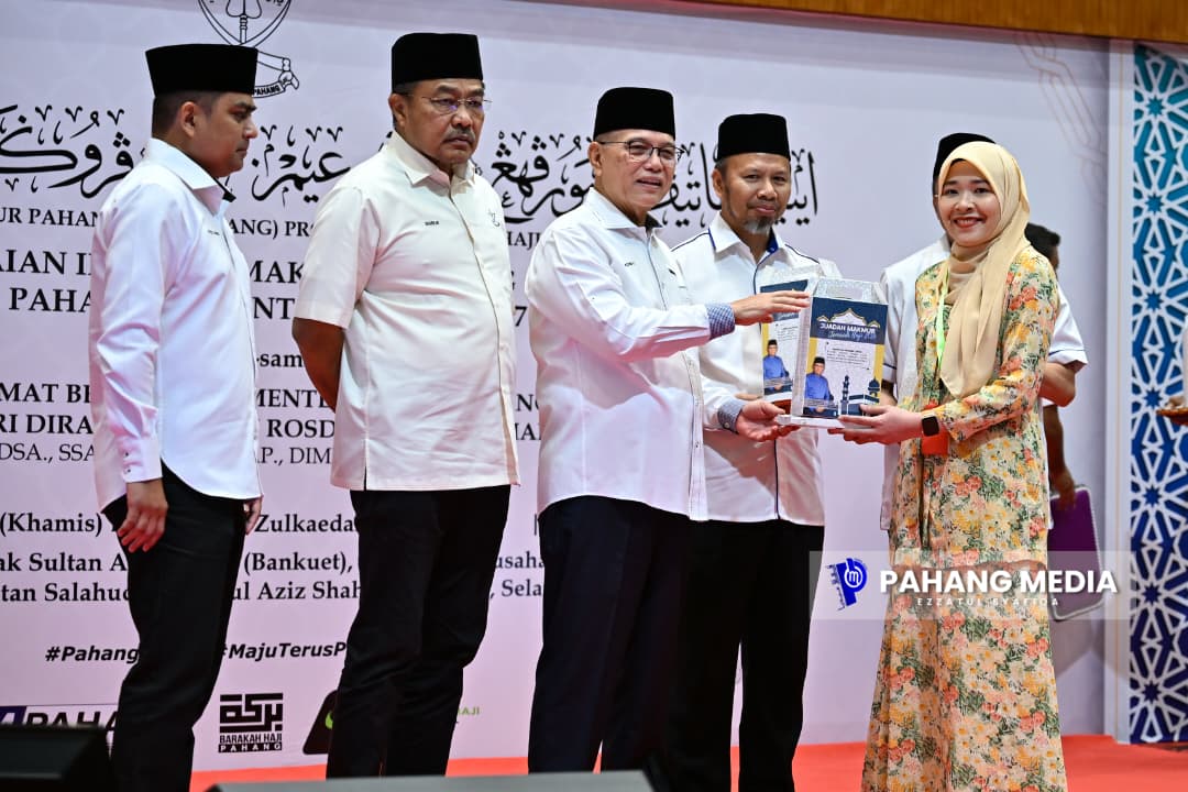 “Meraikan jemaah haji daripada Pahang, anak Pahang yang berada di perantauan, seramai 144 orang. Di mana dalam majlis hari ini, Kerajaan Negeri berkesempatan menyampaikan bantuan RM750 seorang, kemudian retort dan juga buku-buku himpunan doa yang boleh mereka bawa semasa pergi ke Tanah Suci nanti.