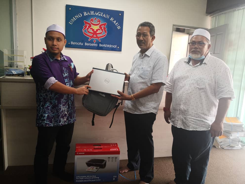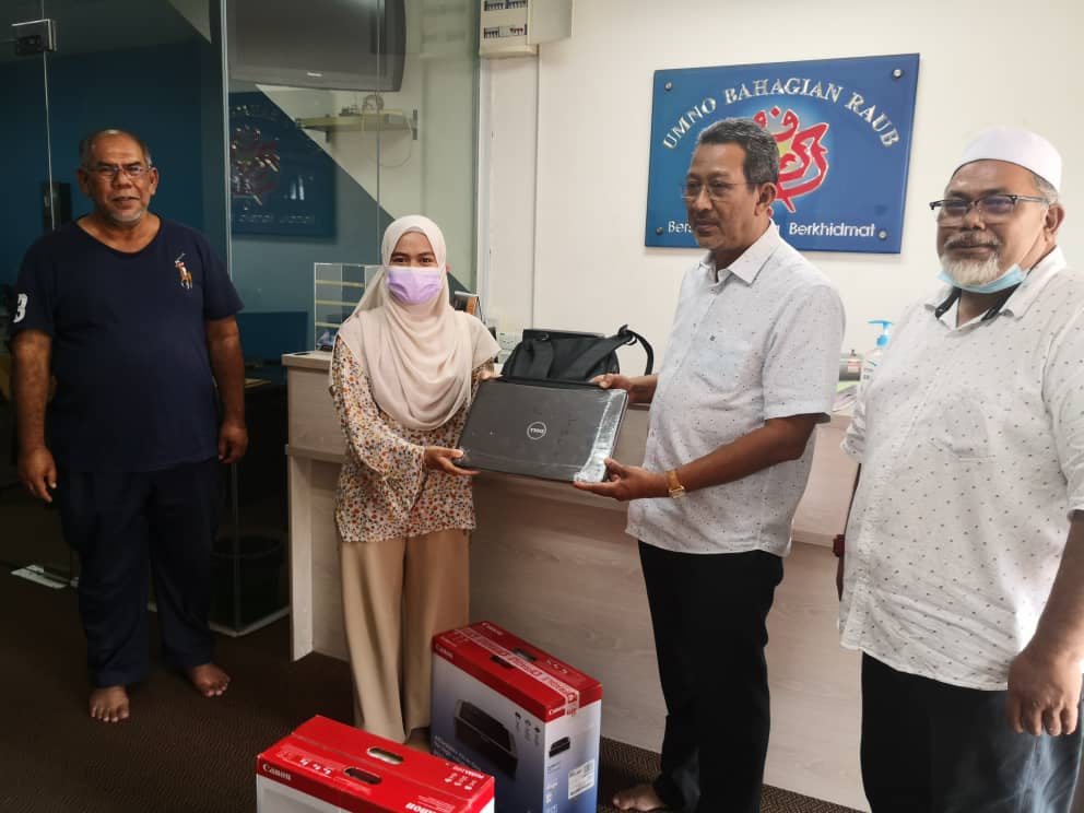 RAUB, 16 OKTOBER 2020: Dua individu menerima sumbangan komputer riba dan mesin pencetak daripada Pengerusi Jawatankuasa Pembangunan Luar Bandar Dan Hal Ehwal Orang Asli Negeri Pahang, YB. Dato’ Abd Aziz Haji Mat Kiram dalam satu majlis di Pejabat UMNO Bahagian Raub di sini, semalam.